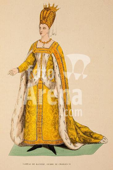 akg2467693 Isabeau (Elizabeth), Queen (Charles VI) of France. Daughter of Duke Stephans III of Bavaria-Ingolstadt. Munich 1370 - Paris 30 September 1435. "ISABEAU DE BAVIERE, FEMME DE CHARLES VI.". Original wood engraving, by E. Duverger after contemporary portrait. From: (Jacques Joseph van Beveren and Charles Du Pressoir), Costume du Moyen, 1847, Plate 64. The book of the French Revolution, vol. 2, Brussels (Librairie Historique-Artistique). Private collection. Museum: PRIVATE COLLECTION.