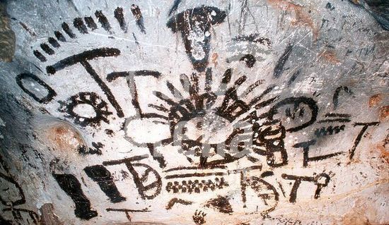 akg2502253 Magura Cave, Bulgaria, interior, sanctuary hall: rock painting made of bat guano droppings showing oldest European solar calendar (366 days, 5 festival events or seasons); background: Magura Cave, also called Rabisha Cave is located in northeastern Bulgaria, 17 km from Belogradchik, in the limestone Rabisha burial mound (altitude: 461 m). It consists of main gallery and three side branches. The overall length of the cave is app. 2500 m. The temperature in the cave is a constant 12° C. Magura Cave started to shape 15 million years ago. In one of the caverns prehistoric paintings have been discovered, carved into the walls and decorated with bat guano (droppings). The paintings depict silhouettes of women, men dancing and hunting, people wearing masks, animals, stars, tools, and plants. The paintings date from different eras - the early Paleolithic, the Neolithic, the later Neolithic, and beginning of the Bronze Age. Youngest paitnings are from 1200 BC. A solar calendar from the late Neolithic found there is the earliest solar calendar discovered in Europe. It is painted on the walls of the sanctuary hall and depicts 5 festival events or season and 366 days. Magura Cave is candidate as UNESCO World Heritage Site. Visit also Magura Winery & Cave! Situated next to village and lake of Rabisha (the biggest Bulgarian sweet water reservoir and a nature beauty), 15 million years old Magura Cave is the largest of its kind in the country and houses outstanding, 2007 - 2011 restored, Neolithic and early Bronze age rock paintings, made of bat guano and realized until 1200 BC. One part, the Magura Bat Gallery, is the place for ageing of selected wines at a constant temperature of 12°? and appropriate humidity. Test famous dry and best Bulgarian sparkling wine "Magura", a 2006 "Cuvée du Nord" from the Rendezvous series, whose selection 2003 became first Bulgarian wine honored with the prestigious Silver Medal of Decanter World Wine Awards. And do not forget to ask for the grape br.