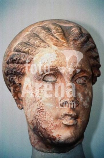akg268402 Greek, work of the Messenian sculptor Damophon, 2nd century BC. Colossal head of the god Artemis. Marble, height 75 cm. From a group of the goddesses Despoina and Demeter in the middle and Artemis and Titan Anytos at either ends. Despoina, Lykosoura, Arcadia. Inv. Nr. 1735. Athens, National Archaeological Museum. Museum: Athens, National Archaeological Museum.