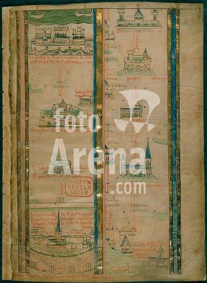 akg269117 England. Part of an itinerary from London to Jerusalem (London to Dover) with representations of towns and notes of the length of each day's journey (written in French). Manuscr. illumination, English, c. 1250/59. From: Matthew Paris, Historia Anglorum. Ms. Royal 14, C.VII, fol. 2. London, British Library. Museum: London, British Library. Copyright: Additional permissions needed for non-editorial use.