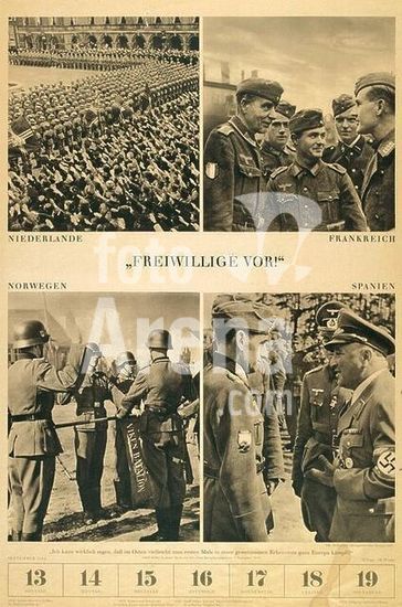 akg271071 History / World War II. Support troops. "Volunteers Step Foreward!" (Recruitment of volunteers for serving in the German Wehrmacht and the Weapon's SS in the Netherlands, France, Norway and Spain. PK-photos (Rompl), undat. (Calender page, September 1). Berlin, Sammlung Archiv für Kunst und Geschichte. Museum: Berlin, Sammlung Archiv für Kunst und Geschichte.