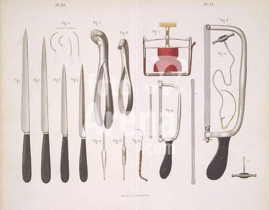 akg285587 Medicine / Surgery. Surgical instruments. Steel engraving, coloured, unsigned. From: Claude Bernard & Charles Huette, "Précis iconographique de médecine opératoire et d'anatomie chirurgiale", Paris (Méquignon-Marvis) 1856, Plates III/IV. Berlin, Sammlung Archiv für Kunst und Geschichte. Museum: Berlin, Sammlung Archiv für Kunst und Geschichte. Author: ANONYMOUS.