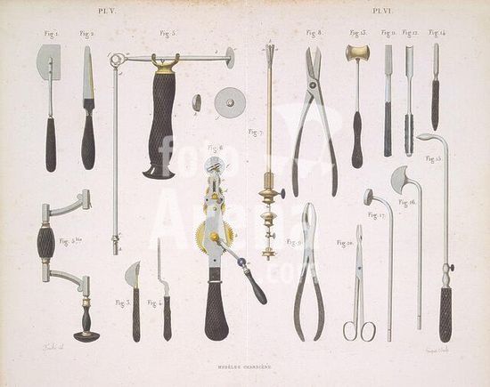 akg285588 Medicine / Surgery. Surgical instruments. Steel engraving, coloured, by Guiguet after Fouché. From: Claude Bernard & Charles Huette, "Précis iconographique de médecine opératoire et d'anatomie chirurgiale", Paris (Méquignon-Marvis) 1856, Plates V/VI. Berlin, Sammlung Archiv für Kunst und Geschichte. Museum: Berlin, Sammlung Archiv für Kunst und Geschichte. Author: Fouché. GUIGET.