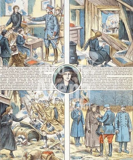 akg290025 Moreau, Emilienne French war heroine (World War I). - "Une Gloire française - Emilienne Moreau - L'Héroine de Loos" (Depiction of Emilienne Moreau's heroic acts during WWI).- Colour print of illustration by Georges Bigot (1860-1927). From: La Grande Guerre (..), Imagerie d'Épinal, No. 120, 1915. Paris, J.P. Verney Collection.