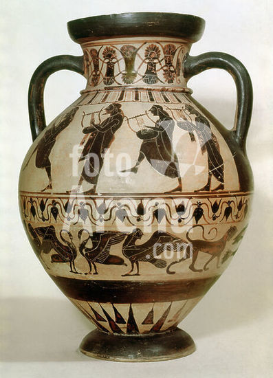 akg3003136 Griechische Vasenmalerei, attisch, schwarzfigurig, archaisch, Omaha-Maler, um 560/550 v.Chr.. - Lyraspieler und Fries mit Tieren. - Halsamphora, Seite B (Seite A: Geburt der Athena aus dem Haupt des Zeus). Ton, gebrannt, schwarz bemalt, Höhe 137,5 cm, Durchmesser 27 cm. Fundort: Etrurien (Italien). Inv.Nr. E 861. Département des Antiquités grecques, étrusques et romaines. Paris, Musée du Louvre. Museum: Paris, Musée Du Louvre.