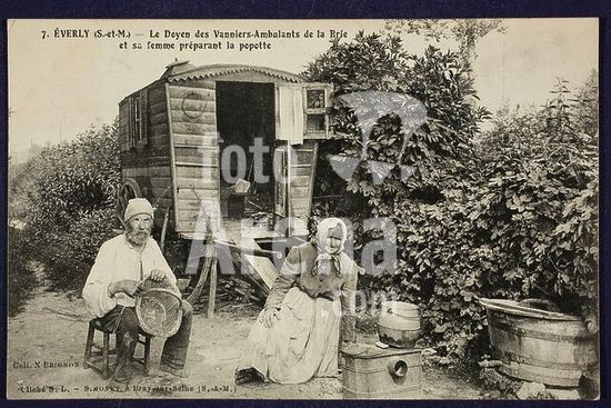 akg3005525 "7. ÉVERLY (S.-et-M.) - Le Doyen des Vanniers-Ambulants de la Brie et sa femme préparant la popotte". (Éverly, Département Seine-et-Marne, Frankreich: der Älteste der umherziehenden Korbmacher der Brie mit seiner Frau bei der Essenszubreitung). Fotopostkarte, undatiert, Bray-sur-Seine, Seine-et-Marne (Collection N. Brignon, Cliché S. L. - S. Monet) um 1900. Privatsammlung. Museum: PRIVATE COLLECTION.