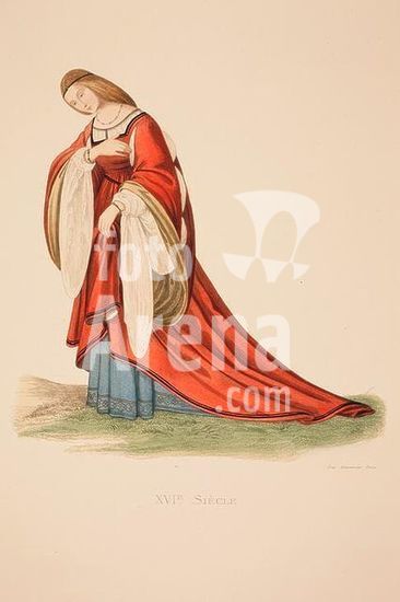 akg3011155 Isabella d'Este, Herzogin (Francesco Gonzaga) von Mantua; Ferrara 18. 5. 1474 - ebd. 13. 2. 1539. - "XVIe Siècle / Isabelle d'Este, Comtesse de Mantoue". - Radierung, koloriert, von Edmond Lechevallier-Chevignard (1825-1902) nach historischer Vorlage. Aus: Edmond Lechevallier-Chevignard und Georges Duplessis, Costumes historiques des XVIe, XVIIe et XVIIIe siècles, dessinés par E. Lechevallier-Chevignard, gravés par A. Didier, L. Flameng, F. Laguillermie, etc., avec un texte historique et descriptif (...), Bd.1, Paris (Librairie d'architecture de A. Lévy) 1867. Privatsammlung. Museum: PRIVATE COLLECTION. Author: EDMOND LECHEVALLIER-CHEVIGNARD. LEOPOLD FLAMENG. ADRIEN DIDIER. FREDERIC LAGUILLERMIE.