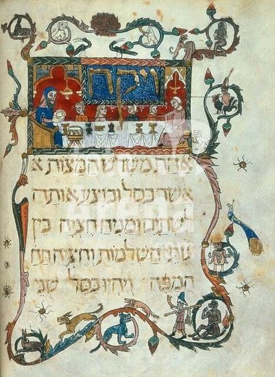 akg301373 Jewish manuscript illumination, Spain, 1350. A family celebrating Passover. From the Barcelona Haggadah. Ms. Add. 14761, fol. 20 v, London, British Library. Museum: London, British Library. Copyright: Additional permissions needed for non-editorial use.