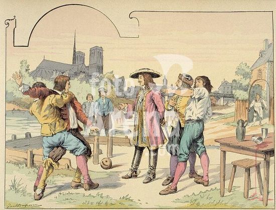 akg305470 Turenne, Henri de Latour d'Auvergne, Vicomte de; French marshal; 1611-1675. "Turenne et les joueurs de boules". (Turenne is asked to referee a game of boules in Paris). Colour lithograph after an illustration by Paul Dufresne. From: Théodore Cahu, "Histoire de Turenne (...)", Paris (Firmin-Didot & Cie), 1898, figure after p. 34. Paris, private collection.