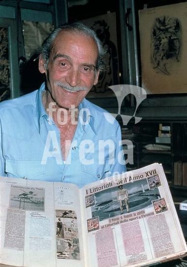 akg305667 Coftis, Tino; athlete (Olympic medal in 110 m hurdles), today antique dealer and souvenir merchant in Alexandria. Tino Coftis with newspaper clips from 1940. Photo, 1982. Copyright: For editorial use only.