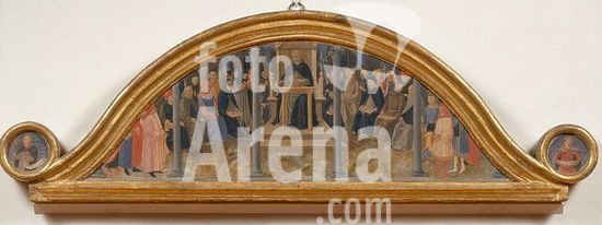 akg308605 Fra Angelico, real name Fra Giovanni da Fiesole, 1387-1455, Workshop. "The School of Albertus Magnus". (Albertus Magnus; scholastic phlosopher and Saint; c. 1193 - 1280). Tempera on wood, 47 × 150cm. Inv. no. 8488. Florence, Museo di San Marco. Museum: Florence, Museo di San Marco.
