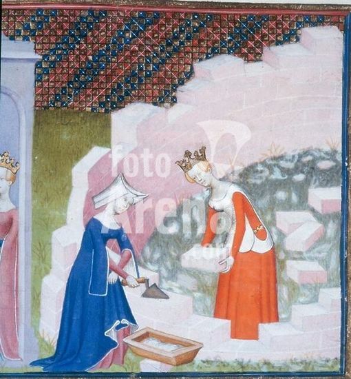 akg309099 Christine de Pizan; French poet. Venice 1365 - Poissy (?) c. 1430. Christine de Pizan builds the ideal city. Illustration to Le Livre de la Cité des Dames. Manuscript illumination, French, c. 1411/12. From the Collected Works of Christine de Pizan. Ms. Harley 4431, fol. 290. London, British Library. Museum: London, British Library. Copyright: Additional permissions needed for non-editorial use.