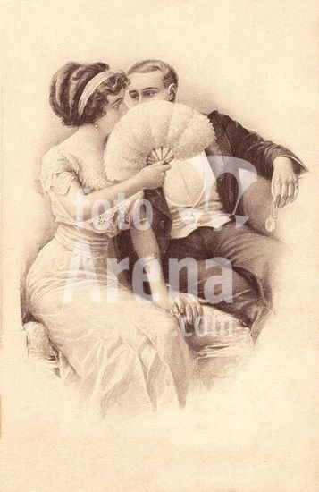akg3091552 Liebe / Liebespaar. - Liebespaar, hinter einem Fächer tuschelnd. - Bildpostkarte, um 1910, nach Zeichnung von Franz Kuderna (1882-1943). Privatsammlung. Museum: PRIVATE COLLECTION.