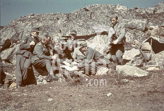 akg325290 Dietl, Eduard; Colonel General (as of 1943 Commander-in-Chief of German troops in Lapland) 1890-1944. Russian campaign June 1941: l. to r.: surgeon Pervolesku, Col. Hofmeister, General Dietl, Lt. Seume, Lt. Krause + Finnish Col. (in background) with Adjutant during briefing in the regiment's command post (136t h Mountain Infantry Regiment). Photo.