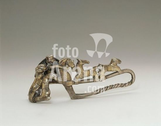 akg333391 Celtic, 3rd century BC. Fibula with hunting scene. Silver. Found at Canete de los torres (Spain). Madrid, Museo Arqueologico Nacional. Museum: Madrid, Museo Arqueológico Nacional.