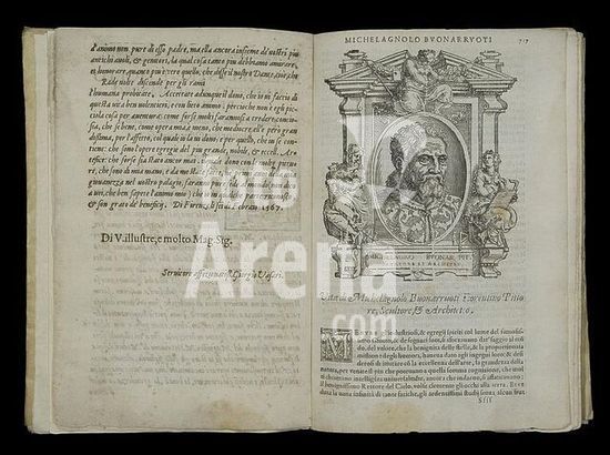 akg3335332 Michelangelo Buonarroti; italienischer Bildhauer, Maler und Architekt; Caprese 6. 3. 1475 - Rom 18. 2. 1564. - Doppelseite aus Vasaris Viten mit Porträt Michelangelos und Beginn seiner Vita. - Holzschnitt. Aus: Giorgio Vasari, Le vite de' più eccellenti pittori, scultori, e architettori, 2. Ausgabe Florenz (Giunti) 1568, S. 716/717. Inv. Nr. j 5438 i (raro). Florence, Kunsthistorisches Institut Florenz. Museum: Florence, Kunsthistorisches Institut Florenz.