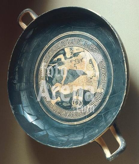 akg342196 Vase painting, Attic, red-figure, 2nd part of the 5th century BC. (Marlay-painter?). Death of Cassandra (Clytemnestra kills Cassandra). Kylix. Ferrara, Museo Archeologico Nazionale. Museum: Ferrara, Museo Archeologico Nazionale.