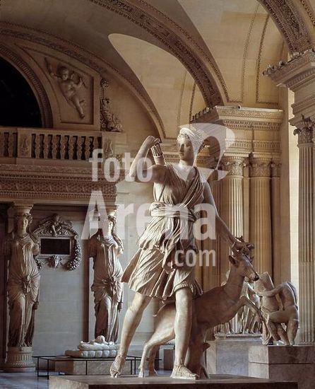 akg349921 Paris (Frankreich), Louvre. Innenansicht der Abteilung für griechisch-etruskisch-römische Kunst.-Karyatidensaal. Im Vordergrund: "Artemis von Versailles", Jagdgöttin Diana in Begleitung einer Hirschkuh.-Höhe, 2 m. Marmor, hellenistisch. Foto.
