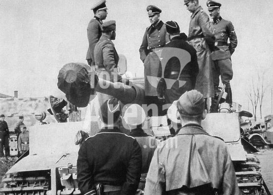 akg352823 Guderian, Heinz ; général en chef ; Culm sur Weichsel (Prusse orient.) 17.6.1888 - 1888 - Schwangau (Souabie) 15.5.1954. Guderian (au centre) examinant un char "Tigre" au cours de sa visite à la division de la garde blindée SS "Adolf Hitler" déployée sur le front (bataille de Kharkiv). PK-Photo (Ohlemacher), April 1943.