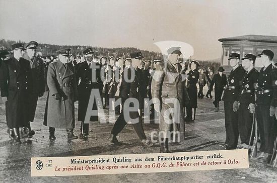 akg353389 Quisling, Vidkun; Norwegian officer and politician, leader of facist party Nasjonal Samling, 1942-45 head of national government under German Reich Commissar Terboven; 18 July 1887 Fyresdal - 24. January 1945 Oslo (executed). Quisling (foreground) returning from a meeting with Hitler at the Fuhrer headquarters. Photo, undated.