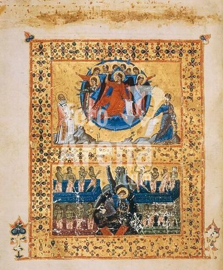 akg360905 Illuminated manuscript, Byzantine, 12th Century. The vision of the Prophet Habakkuk and the rising of the dead. From: Homily of Gregory of Nazianzus. Ms. grec 543, fol. 27 v. Paris, Bibliothèque Nationale. Museum: Paris, Bibliothèque Nationale.