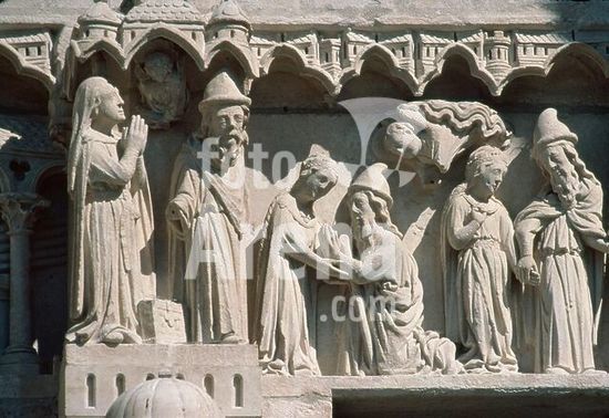 akg367328 Paris Cathédrale Notre-Dame (commencée en 1163), façade ouest, portail Sainte-Anne. - Rencontre à la Porte d'Or entre Joachin et sainte Anne. Sculpture, début du XIIIe siècle.