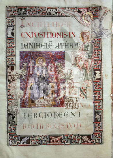 akg3886350 Buchmalerei, Frankreich, Burgund, Scriptorium der Abtei Cîteaux, 1. Drittel des 12. Jahrhunderts. - Incipit-Seite mit historisierter Initiale "A" (Anno tercio regni Ioachim) mit Darstellung: Daniel in der Löwengrube und Habakuk, von einem Engel am Schopf zu Daniel getragen. - (Daniel 14,23-42). Aus: S. Hieronymi explanationes in Prophetas et Ecclesaisten (Kommentar des Hieronymus zum Buch Daniel, zu den zwölf kleinen Propheten und zum Ecclesiaticus). Pergamenthandschrift, 209 folios. Blattformat 43,5 x 31 cm. Aus der Bibliothek der Abtei Cîteaux. Ms 132, fol. 2 verso. Dijon, Bibliothèque Municipale. Museum: Dijon, Bibliothèque Municipale. Author: ANONYMOUS.