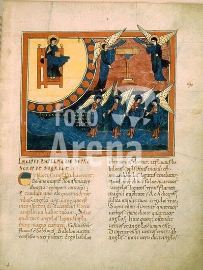 akg398034 Illuminated manuscript, French, 11th Century. - The Four Horsemen of the Apocalypse. (Book of Refelation 9,14-19). The Apocalypse according to St. Sever. Ms. latin 8878, fol. 147, Paris, Bibliothèque Nationale. Museum: Paris, Bibliothèque Nationale.