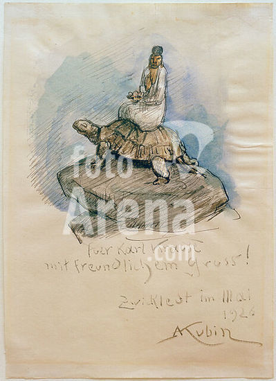 akg4041160 Kubin, Alfred 1877-1959. "Inder/Buddha auf einer Schildkröte sitzend", 1926. (Mit Widmung: "Fuer Karl Krause mit freundlichem Gruss! /. Zwickledt im Mai 1926"). Feder in schwarz, Aquarell, 21,7 x 15,6 cm. Inv. 1609. Regensburg, Kunstforum Ostdeutsche Galerie. Museum: Regensburg, Kunstforum Ostdeutsche Galerie. Copyright: © Alfred Kubin. This artwork is not in the public domain. Additional copyright clearance may be required before use of this image.