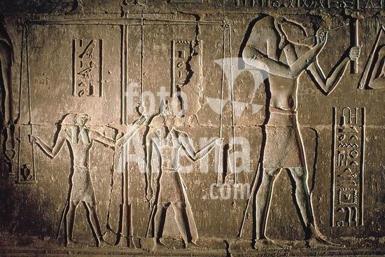 akg421848 Egyptian, Ptolomaeic period, 3rd/2nd century BC. Thoth, moon god and god of the calendar and time, writes the judgement of the court of death, behing him Anubis and Horus weigh the heart of the dead. Relief. Deir el-Medinah (Thebes West, Egypt), temple, left chapel, left wall.