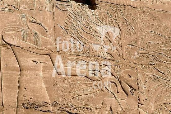 akg421854 Egyptian, New Kingdom, 19th Dynasty, c. 1290-1260 BC. Thoth (God of the Moon, the calendar and writing) with the head of Ibis standing behind a pharaoh. Sandstone relief. Karnak (Upper Egypt), Temple of Amun-Re, Large pillared hall, north wall.