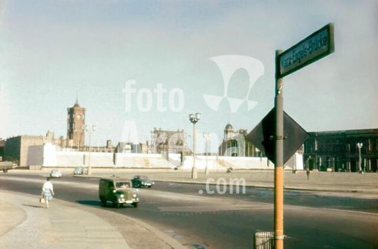 akg422492 Berlin-Mitte, Marx-Engels-Platz (ehem. Schloßplatz). Blick von der Marx-Engels-Brücke auf den Marx-Engels-Platz mit Tribüne und Aufmarschgelände; im Hintergrund das Rote Rathaus. Foto, August 1961.