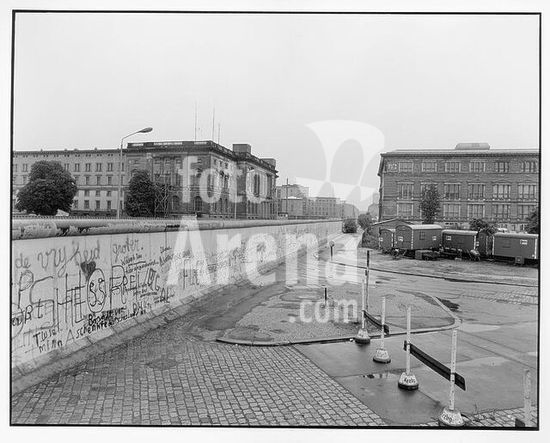 akg431472 Berlin, Berlin Wall - Sector Borders. (1961-1989/90). View of the Wall on corner of Niederkirchner Strasse and Stesemannstrasse; vire to the east with the former Prussian Assembly building (left) and the Martin-Gropius-Bau (right). Photo, 1982.