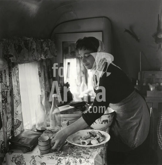 akg433337 Völkerkunde: Sinti und Roma. Roma-Lager in der Umgebung von Paris (Gebiet zwischen Porte de Saint-Ouen und Porte Clignancourt): Junge Frau bei der Küchenarbeit im Wohnwagen. Foto, 1957/58.