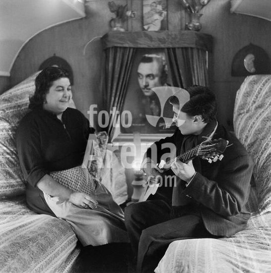 akg433394 Django Reinhardt, (born Jean Baptiste Reinhardt), French Jazzmusiker, Liverchies (Belgium) 23.1.1910 - Fontainebleau 16.5.1953. Jean-Jacques (Gen. Babic), the son of Django, with his mother in the caravan before a portrait of his father (winter camp of the Sinti and Roma outside the gates of Paris, Saint-Ouen). Photo, 1957/58. Copyright: For editorial use only.