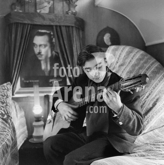 akg433396 Reinhardt, Django (born Jean Baptiste Reinhardt), French jazz musician, Liverchies (Belgium) 23.1.1910. Fontainebleau 16.5.1953. - Jean-Jacques, Django's son in a caravan playing the guitar in front of portrait of his father (Roma winter camp near Paris, Saint-Ouen. Photo, 1957/58. Copyright: For editorial use only.