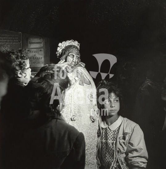 akg433418 France / Sinta and Roma (Romani) people. Woman and children in front of a statue of Saint Sarah in the crypt of the church of Saintes-Maries-de-la-Mer. Photo, France, 1950/60s.