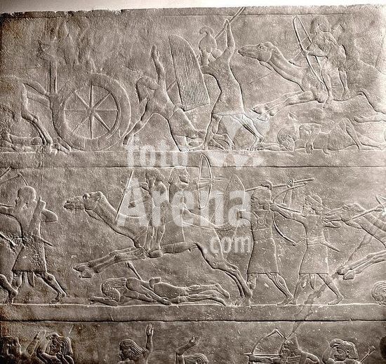 akg442354 Late Assyrian, c. 645 BC. Campaigns of the Assyrian King Assurbanipal: Assyrian troops battling against their enemies on camels. Relief, Stone. Palace of Assurbanipal in Nineveh. (Iraq). London, British Museum. Museum: London, British Museum.