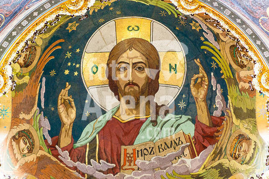 akg4769667 Christ mosaic in dome, Church on Spilled Blood, also Church of the Saviour on Spilled Blood, St Petersburg, Russia.