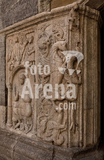 akg4877767 Italien Como Kirche San Fedele 12 Jh 88798 Nordostportal Reliefs links Daniel in der Löwengrube darüber Habakuk und ein Engel rechts Greif einen Drachen schlagend.