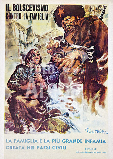 akg5014752 Bolshevism AGAINST THE FAMILY A terrifying Bolshevik complete with a fur hat and red star snatches the son from the arms of the desperate mother. The heartbreaking scene is commented by the quote: "The family is the greatest infamy created in civilized countries - Lenin (the Bolsheviks Code of Civil Rights)". Manifesto of Julius Bertoletti (17 June 1919 to 13 September 1976), Italy, the twentieth year of the Fascist Era - 1942.