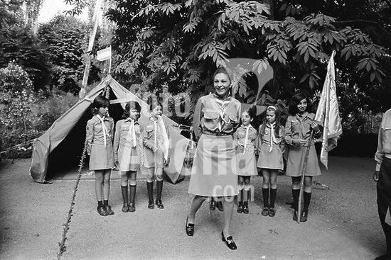 akg5195033 Farah Diba, ab 1959 Gemahlin des Schahs Mohammed Resa Pahlewi, 1967-80 Kaiserin (Schahbanu) des Irans; geb. am 14.10.1938 in Teheran. - Farah Diba in der Kluft der weiblichen Pfadfinderschaft mit jungen Pfadfinderinnen auf einem Zeltlager. - Foto, o.O.u.J., ca. Ende April 1970. Copyright: For editorial use only.