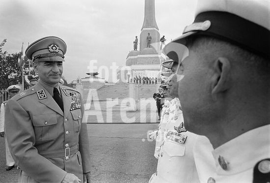 akg5195205 Mohammed Resa Pahlewi (Mohammad Reza Pahlavi), Schah von Persien (1941-80), 1919-1980. - Staatsbesuch in Thailand, Januar 1968: der Schah beim Abschreiten einer Ehrenformation; im Hintergrund das Siegesdenkmal (1941 errichtet, Architekt: Pum Malakul; Statuen auf fünfeckigem Sockel nach Entwürfen von Corrado Feroci, einem italien. Bildhauer). - Foto. Copyright: For editorial use only.