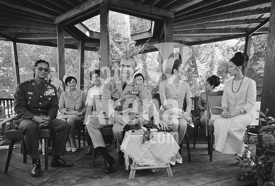 akg5195210 Mohammed Resa Pahlewi (Mohammad Reza Pahlavi), Schah von Persien (1941-80), 1919-1980. - Staatsbesuch in Thailand, Januar 1968: in einem Pavillon auf dem Gelände des Großen Palastes in Bangkok v. li. König Bhumibol (Rama IX), der Schah, Kaiserin Farah Diba und Königin Sirikit. - Foto. Copyright: For editorial use only.