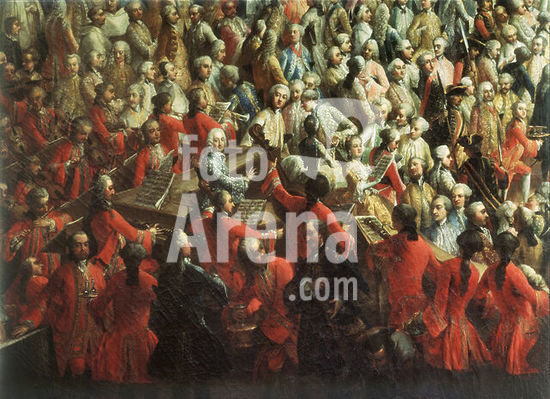 akg5280614 Joseph II., römisch-deutscher Kaiser; 1741-1790. - "Diner bei der Hochzeit Josephs II. mit Isabella von Parma" (Im Redoutensaal der Hofburg in Wien am 5. Oktober 1760)). 1760). - Ausschnitt: Musiker. Gemälde, 1763, von Martin van Meytens (1695-1770). Öl auf Leinwand, 390 x 300 cm. Wien, Schloß Schönbrunn. Museum: Düsseldorf, Museum Kunstpalast. Author: MARTIN VAN MYTENS DER JÜNGERE.