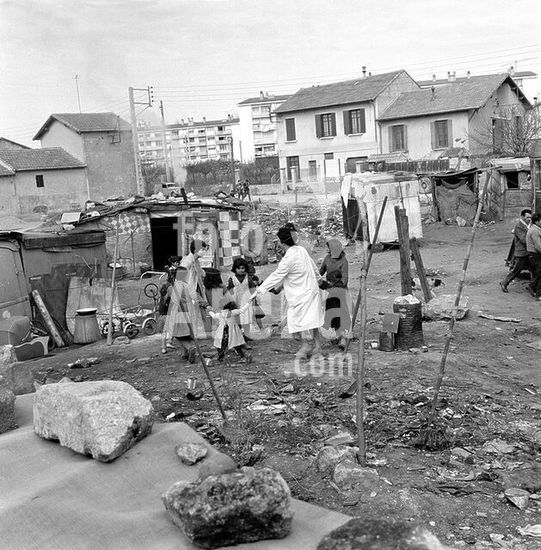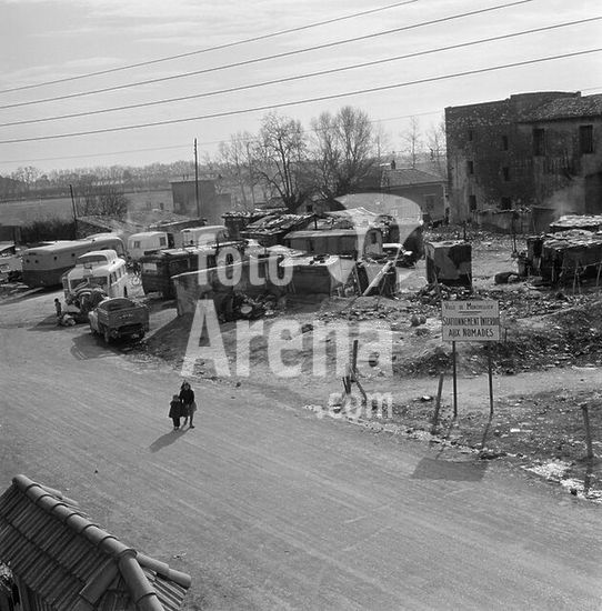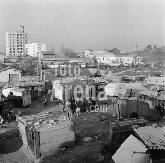 akg5313233 Völkerkunde: Sinti und Roma. Barackensiedlung und Wohnwagen am Stadtrand von Montpellier. Foto, 1961. Aus einer Serie Frankreich: "Secours sociaux - aide des etudiants aux gitans (Montpellier)" (Studenten helfen Zigeunern).