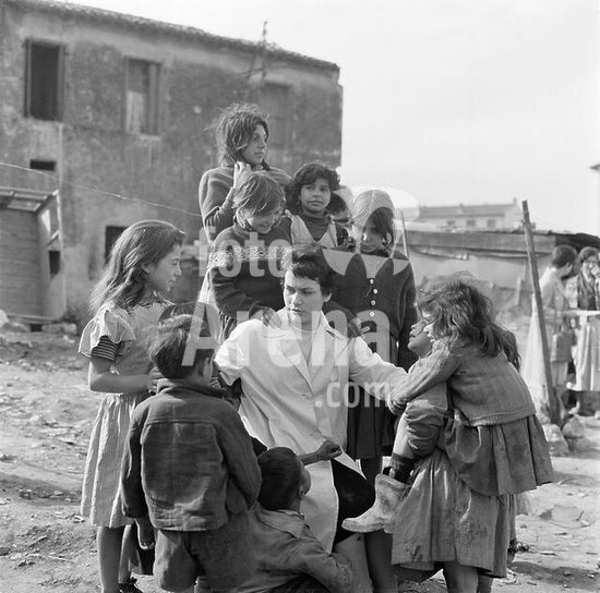 akg5313381 Völkerkunde: Sinti und Roma. Barackensiedlung und Wohnwagen am Stadtrand von Montpellier: Studentin mit Kindergruppe. Foto, 1961. Aus einer Serie Frankreich: "Secours sociaux - aide des etudiants aux gitans (Montpellier)" (Studenten helfen Zigeunern).