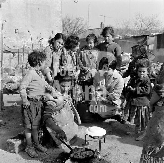 akg5313382 Völkerkunde: Sinti und Roma. Barackensiedlung und Wohnwagen am Stadtrand von Montpellier: Frau bei der Zubereitung von Essen im Freien. Foto, 1961. Aus einer Serie Frankreich: "Secours sociaux - aide des etudiants aux gitans (Montpellier)" (Sozialhilfe - Studenten helfen Zigeunern).
