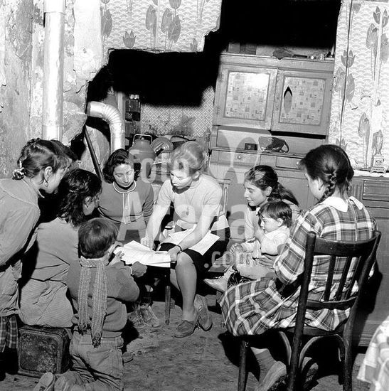 akg5313395 Völkerkunde: Sinti und Roma. Barackensiedlung und Wohnwagen am Stadtrand von Montpellier: Studentin mit Frauen und Kindern. Foto, 1961. Aus einer Serie Frankreich: "Secours sociaux - aide des etudiants aux gitans (Montpellier)" (Sozialhilfe - Studenten helfen Zigeunern).