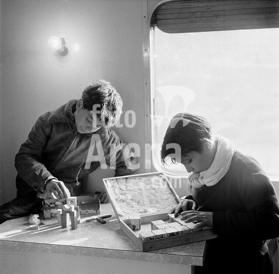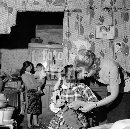 akg5313398 Völkerkunde: Sinti und Roma. Barackensiedlung und Wohnwagen am Stadtrand von Montpellier: Studentin mit jungem Mädchen bei Handarbeiten. Foto, 1961. Aus einer Serie Frankreich: "Secours sociaux - aide des etudiants aux gitans (Montpellier)" (Sozialhilfe - Studenten helfen Zigeunern).